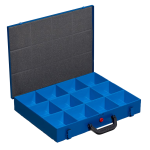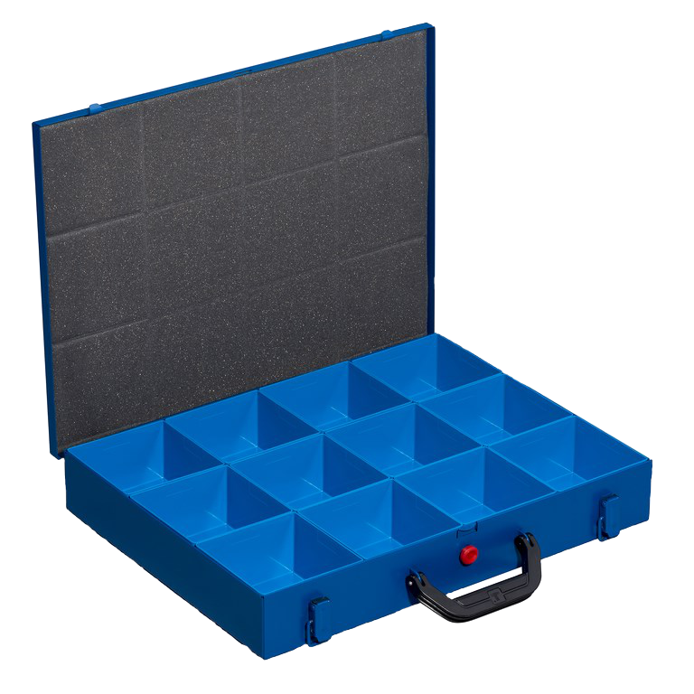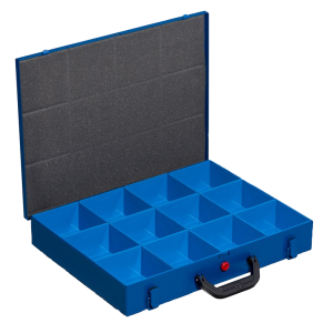 Kaseta wykonana z wysokiej jakości blachy stalowej malowana proszkowo w kolorze niebieskim. W zestawie 12 pojemników o wymiarach: