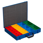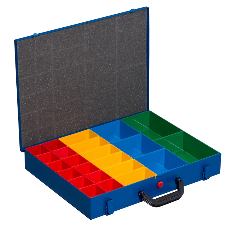 Kaseta wykonana z wysokiej jakości blachy stalowej malowana proszkowo z kolorze niebieskim z 23 pojemnikami o wymiarach: