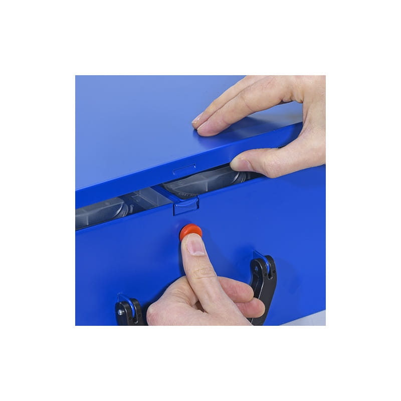 - Bezpieczeństwo transportu: Łączniki zaciskowe na pokrywie zapobiegają przypadkowemu otwarciu podczas transportu.