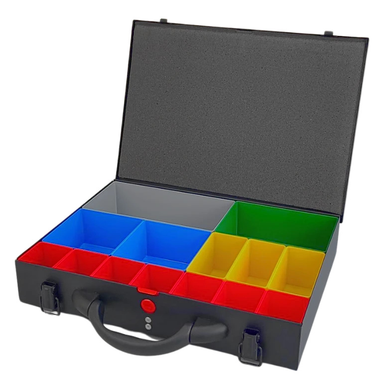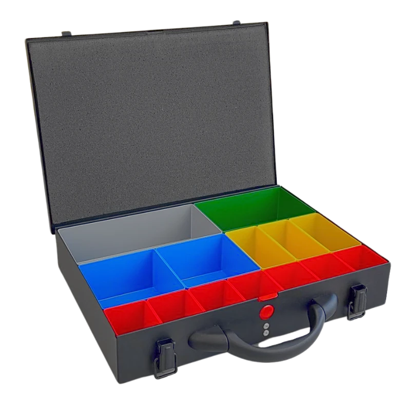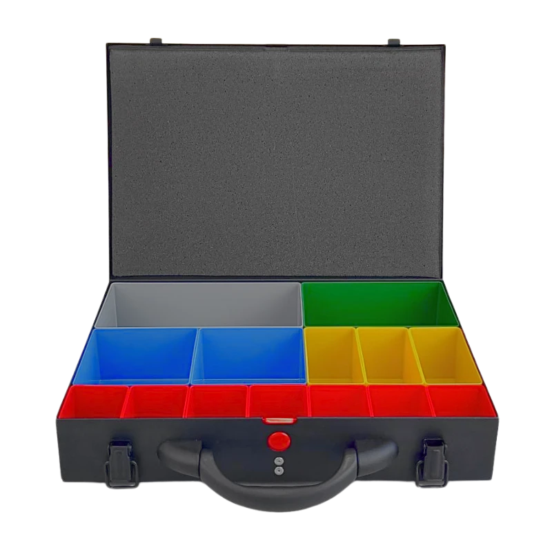 - 14 pojemników wewnętrznych: Kaseta zawiera 14 pojemników o różnych rozmiarach, co ułatwia organizację i przechowywanie drobnych elementów.