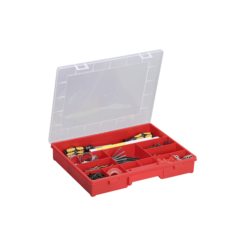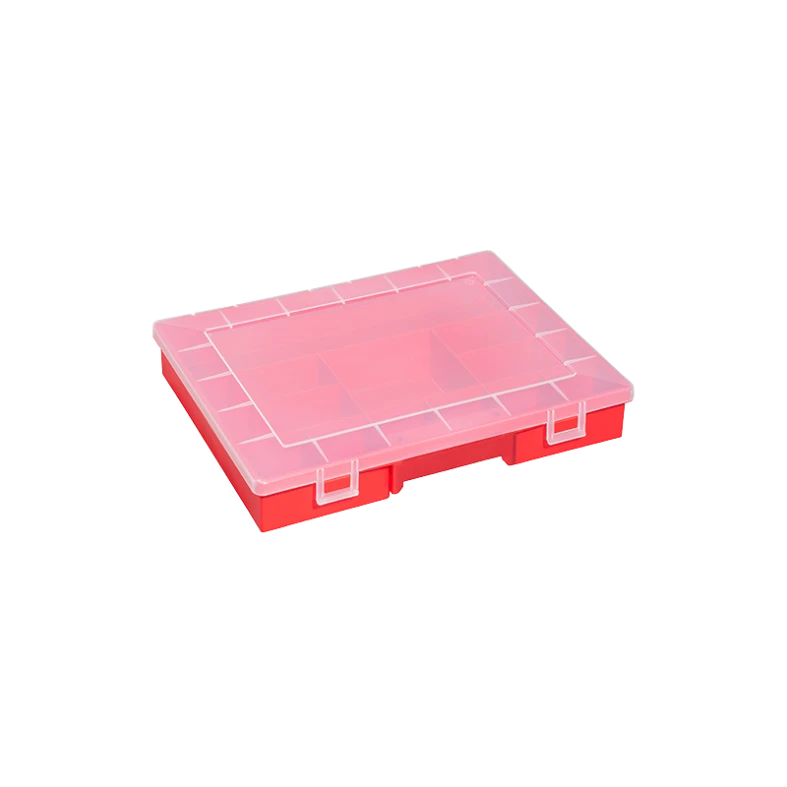 Sporych rozmiarów czerwony organizer wykonany z tworzywa sztucznego posiadający 12 przegród idealny do przechowywania małych elementów, wyposażony w przezroczystą pokrywe z zatrzaskami do zamykania.