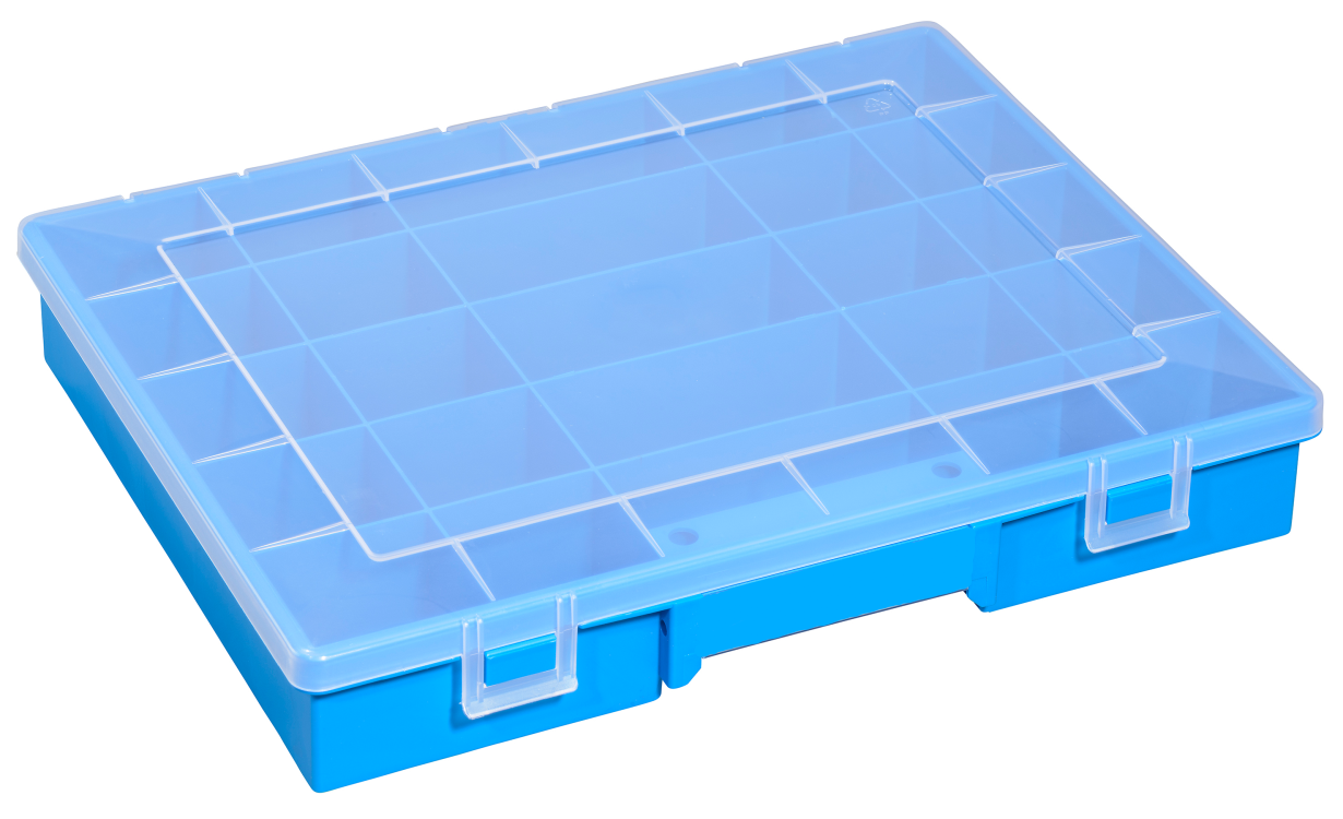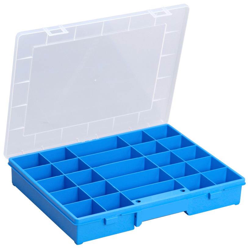 Sporych rozmiarów niebieski organizer wykonany z tworzywa sztucznego posiadający aż 25 przegród idealny do przechowywania małych elementów, wyposażony w przezroczystą pokrywę z zatrzaskami do zamykania. Dobrej jakości tworzywo sztuczne gwarantuje wysoką wytrzymałość i wieloletnią sprawność organizera.