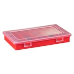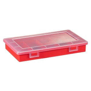 Małych rozmiarów czerwony organizer wykonany z tworzywa sztucznego posiadający 9 przegród idealny do przechowywania małych elementów, wyposażony w przezroczystą pokrywę z zatrzaskami do zamykania. Dobrej jakości tworzywo sztucznego gwarantuje wysoką wytrzymałość i wieloletnią sprawność organizera.