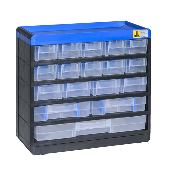 Regalik szufladkowy wyposażony w 17 szuflad o różnych wielkościach, dzięki różnorodności wymiarów szufladek otrzymujemy produkt o szerokim wachlarzu możliwości. Wykonany z tworzywa sztucznego wzmacniany stalowymi drutami w obudowie gwarantuje wysoką żywotność produktu nawet podczas intensywnej eksploatacji.