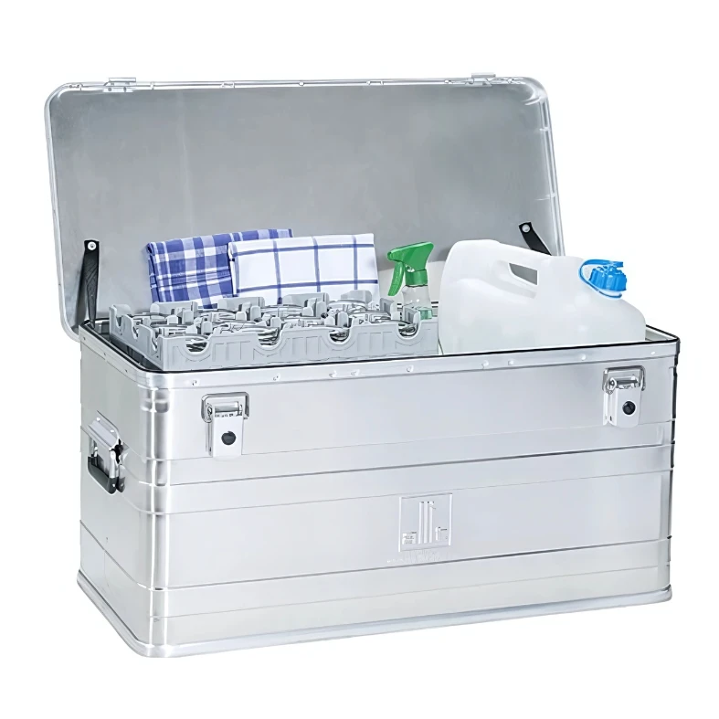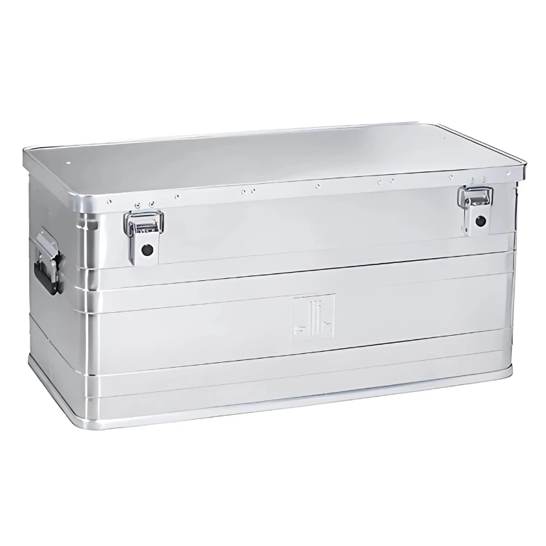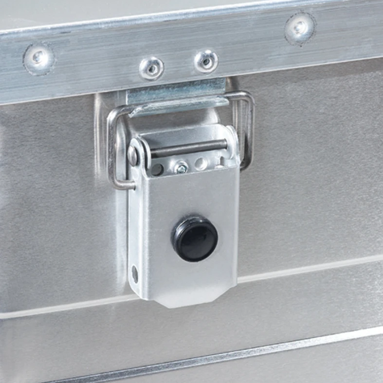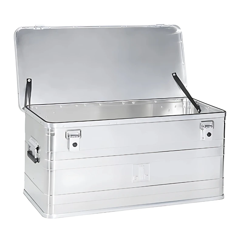Seria profesjonalnych solidnych skrzyń aluminiowych w pięciu rozmiarach z blachy o grubości 0,6 mm wyposażone w nadstawki czyli możliwość układania jednej na drugą co zapewnia bezpieczne ułożenie podczas transportu.