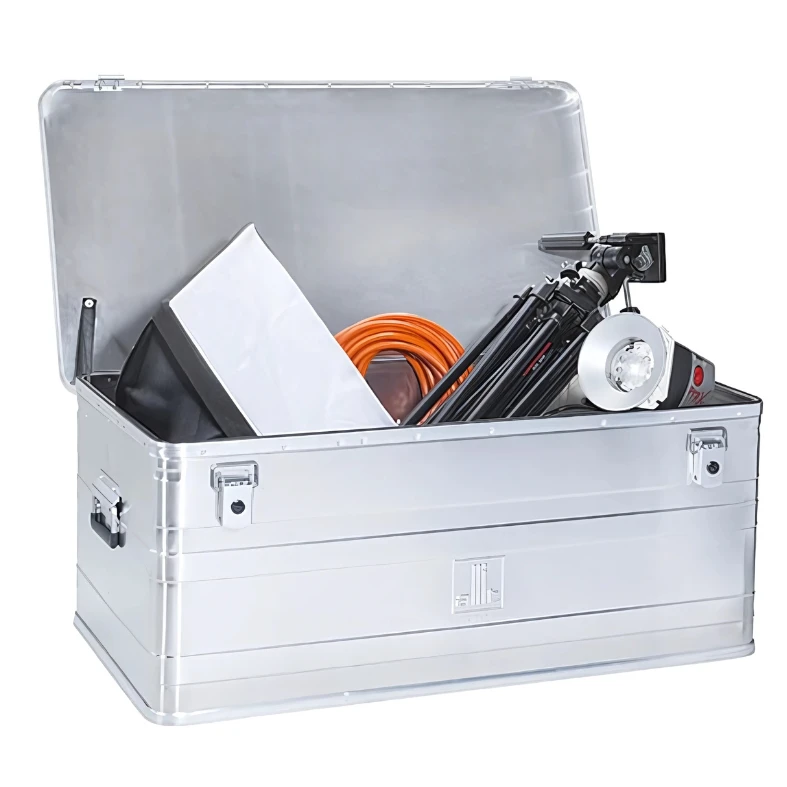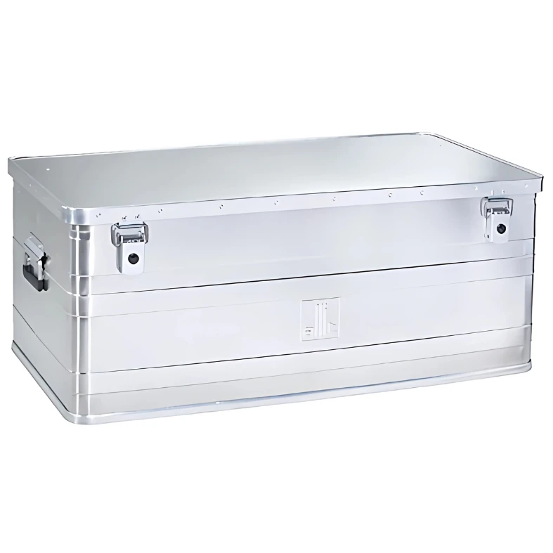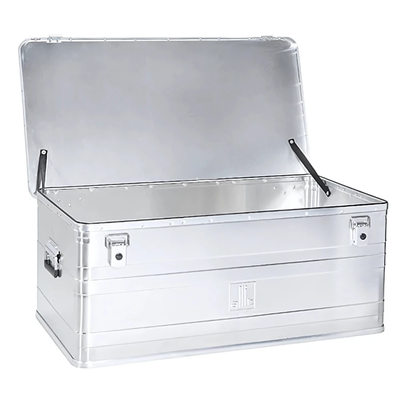 Seria profesjonalnych solidnych skrzyń aluminiowych w pięciu rozmiarach z blachy o grubości 0,6 mm wyposażone w obramowania czyli możliwość układania jednej na drugą co zapewnia bezpieczne ułożenie podczas transportu.